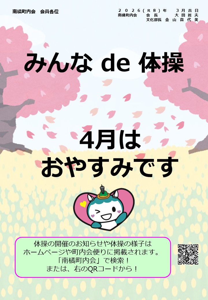 町内会からのお知らせ印刷2026/03/25 14:41 投稿者:財津文化部からのお知らせです。4月の「みんな de 体操」はお休みさせていただきます! <new>文化部からのお知らせです。 4月の「みんな de 体操」はお休みさせていただきます。 5月以降はあらためてご案内させていただきます。 お問い合わせは:南橘町内会文化部 金山さん・山下さん・仲野さん 南橘町内会のページへ戻る