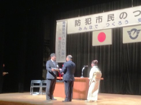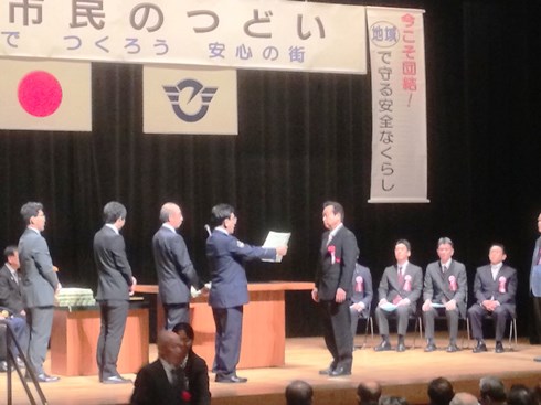 最初の表彰式典では、全地区58人、片瀬地区では5人の方が受賞され、市長及び南北の警察署長から日頃の防犯活動の功績を讃えて表彰状が手渡されました。