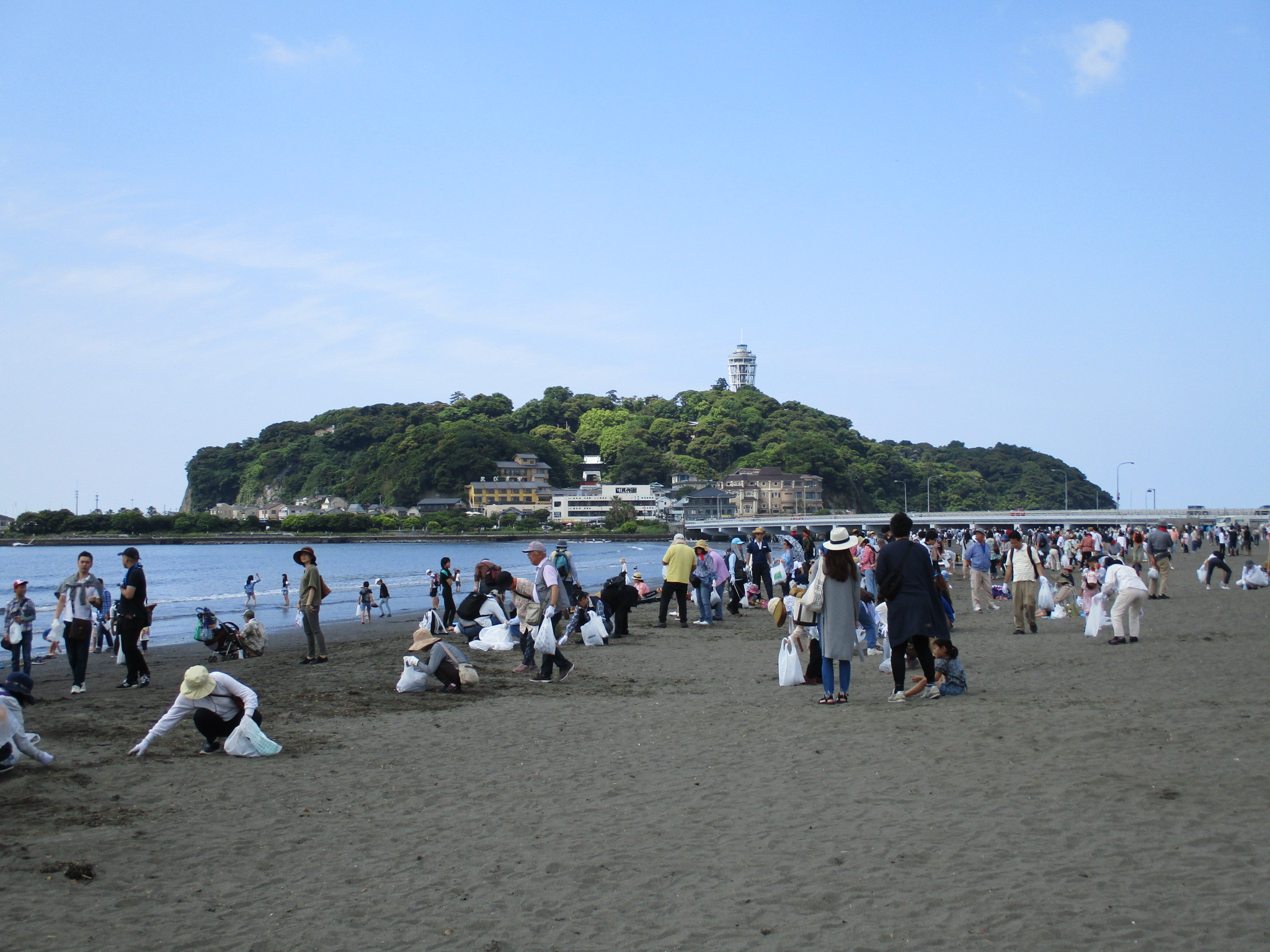 5月28日(日)に、藤沢市のすべての海岸で一斉に行われるボランティア清掃、ゴミゼロクリーンキャンペーンに片瀬地区の皆様と一緒に参加しました。当日は東浜と西浜に分かれて参加し、海岸のごみ拾いを行いました。