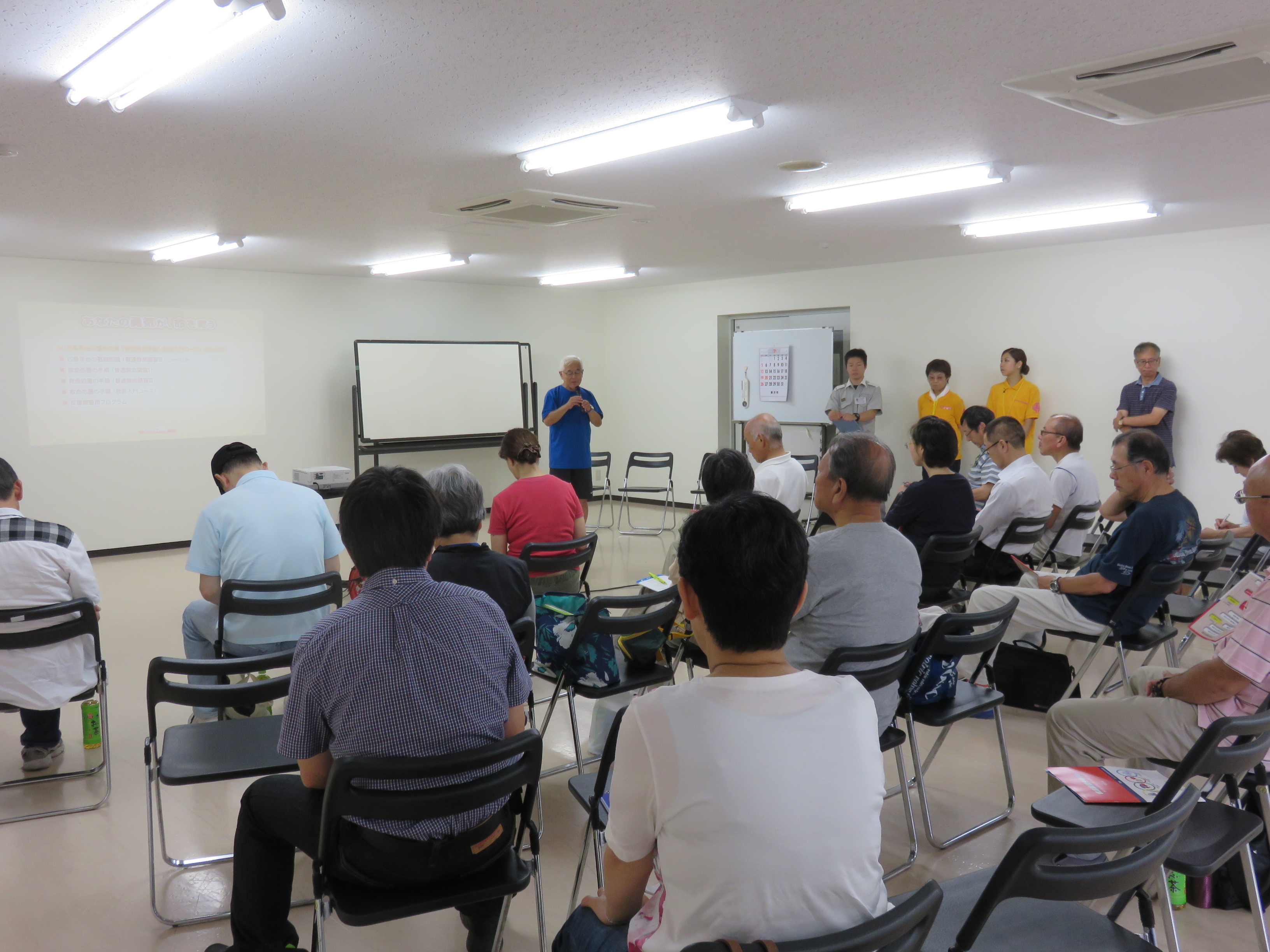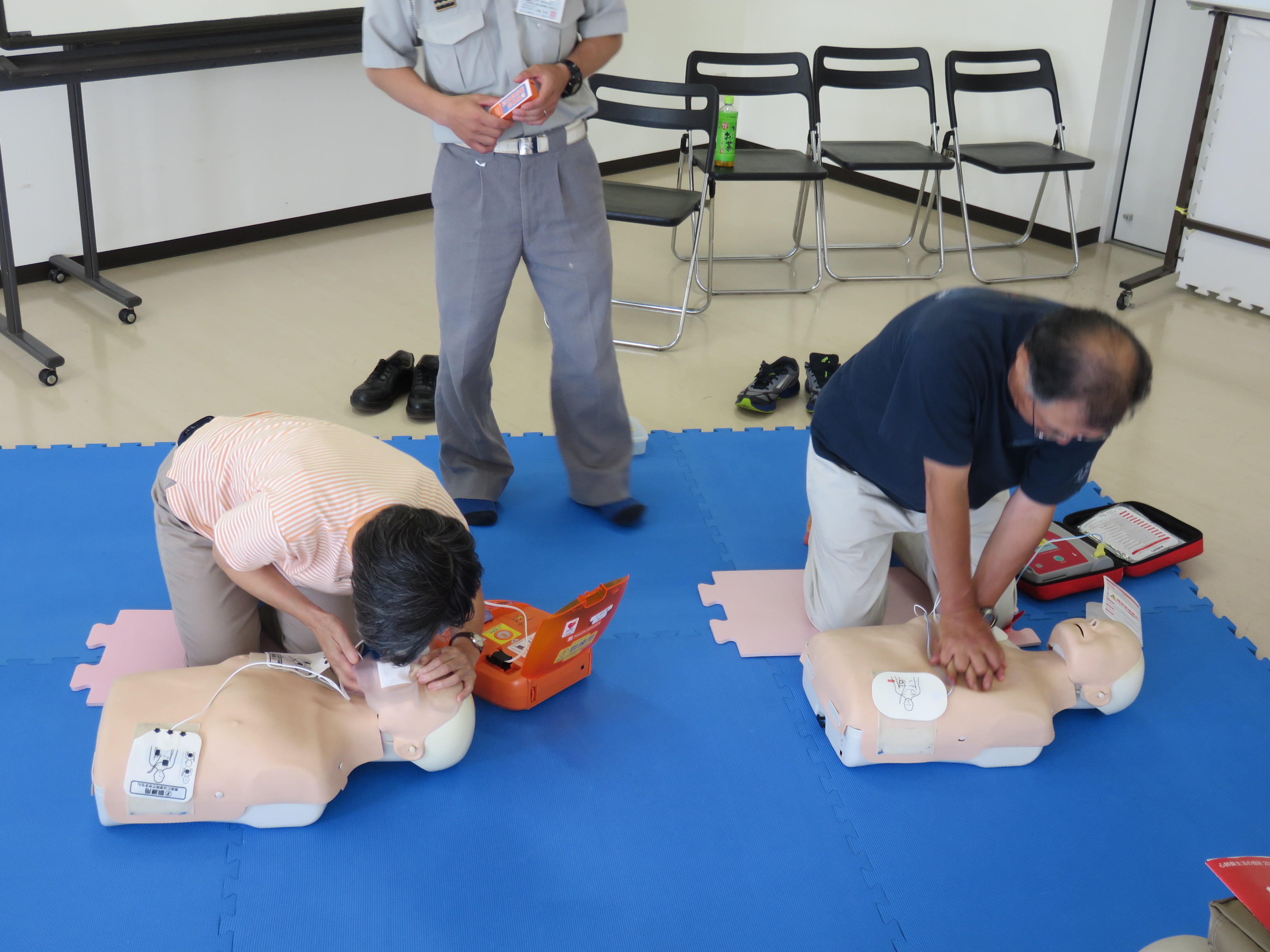 防災リーダー連絡会からのお知らせ印刷2015/07/16 15:12 投稿者:仲瀬救急救命講習会開催7月12日、六会市民センターホールにて、藤沢消防局より3名の講師をお迎えし、救急救命講習会を開催しました。参加者は21名で、3班に分かれ、各班2体の講習用マネキンを使っての濃密な実習をすることができました。本日の講習内容は下記のように充実したものでした。1.倒れている人の救急救命処置(心肺蘇生法) 安全確認と各種手配 胸骨圧迫 人工呼吸 AEDの操作 回復体位の取らせ方2.喉つまりへの救急処置3.止血法 下記をクリックすると拡大してご覧になれます。 防災リーダー連絡会会長挨拶 救急救命の実習 六会地区防災リーダー連絡会へ戻る