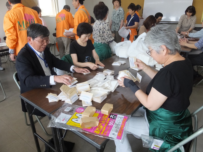 私たち湘南大庭地区は、辻堂駅グループ(明治地区、辻堂東地区、辻堂西地区)に入って、まず、明治市民センターに集合し、活動内容が書かれたPR用チラシをポケットティッシュに差し込む作業をし、その後4地区がそろって”のぼり旗”を持って辻堂駅へ出発! 到着後、辻堂駅コンコースでキャンペーン活動開始。