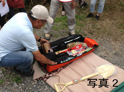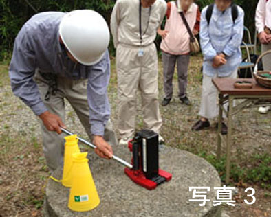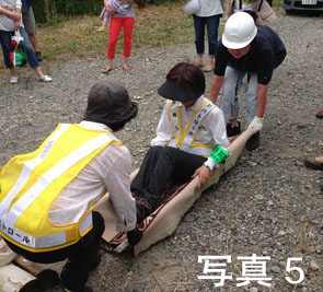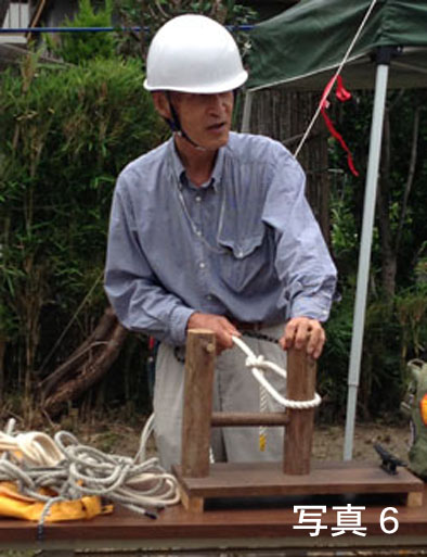 この後、防災倉庫に保管されているレスキューキットの内容、使い方を確認し(写真2)、油圧ジャッキの使い方も確認しました(写真3)。また、担架の組み立て方(写真4)、毛布と物干竿を利用した簡易担架の作り方を学びました(写真5)。最後に、会長より非常時に役立つロープの結び方教室がありました(写真6)。