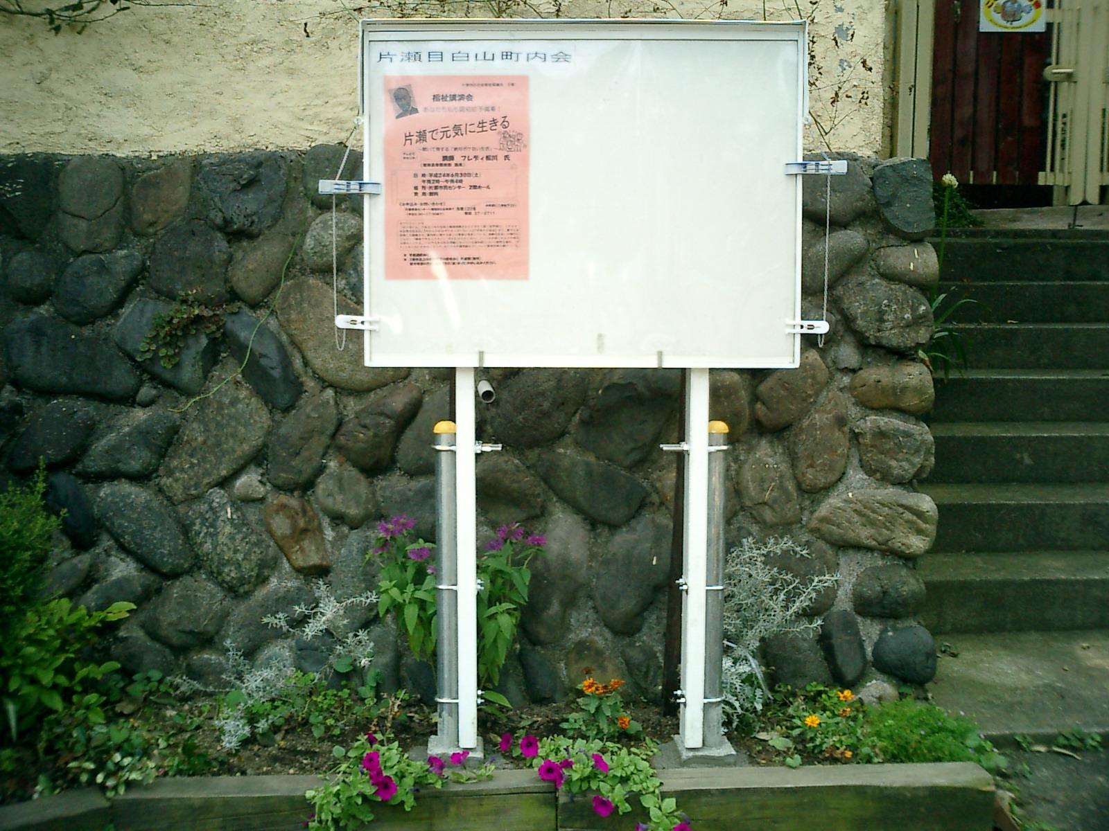 片瀬目白山には2つの掲示板があり、会員宅の軒先をお借りして立ち続け、皆様に役立つ情報を提供してきました。6月19日の台風4号で坂上の掲示板が倒れました。坂下の掲示板は健在です。