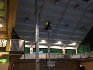 バレー・バスケット・バドミントン・卓球等のできる大体育室として、また地域の集会等にも活用されている【体育室(350人収容・459㎡)】。昨日(8月20日)夜遅くまで照明の交換(LED)作業がされていました。