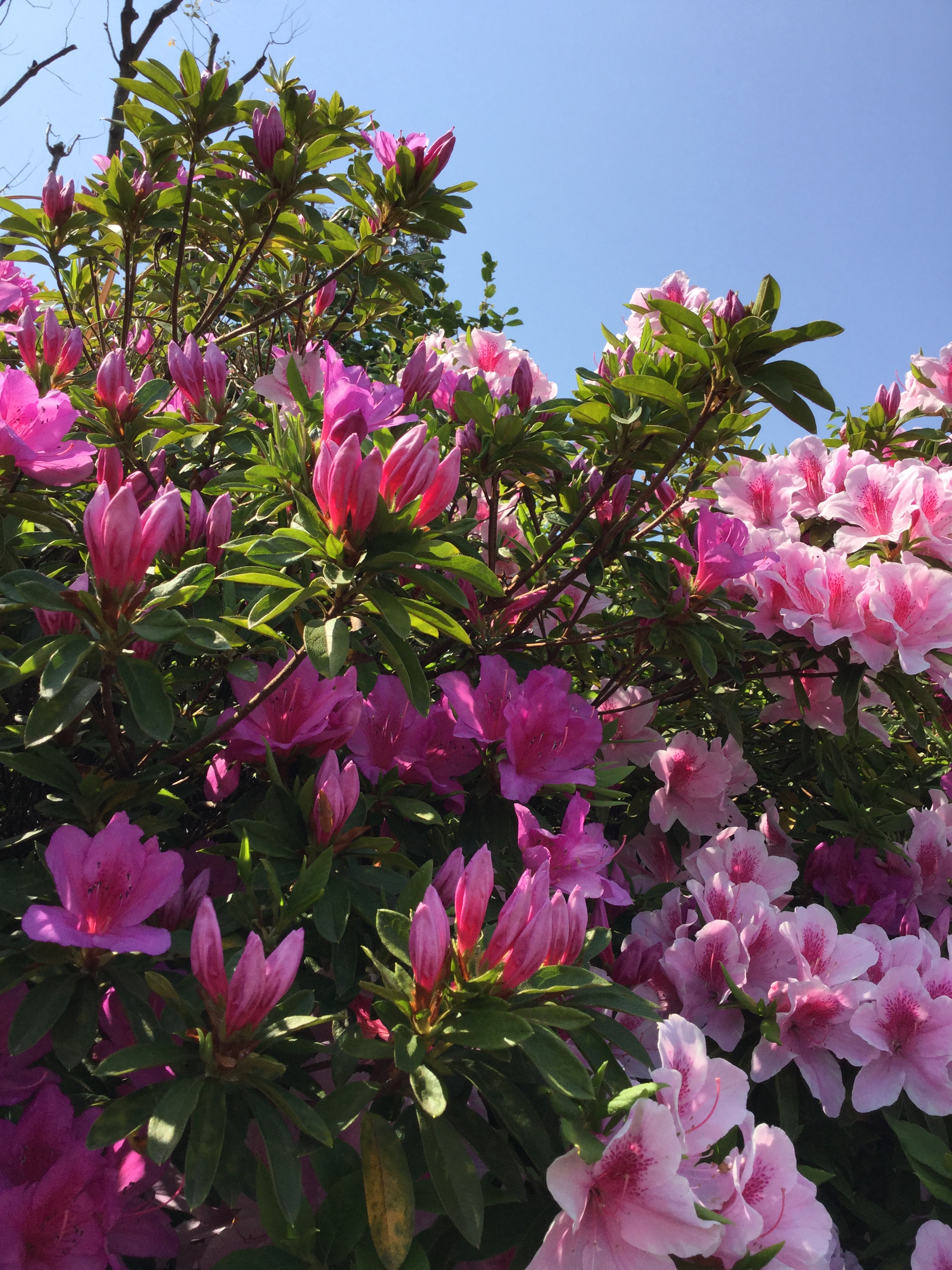 濃いピンクに薄いピンクのきれいなツツジが、春の青空とまぶしい太陽と美しいコントラストでした。