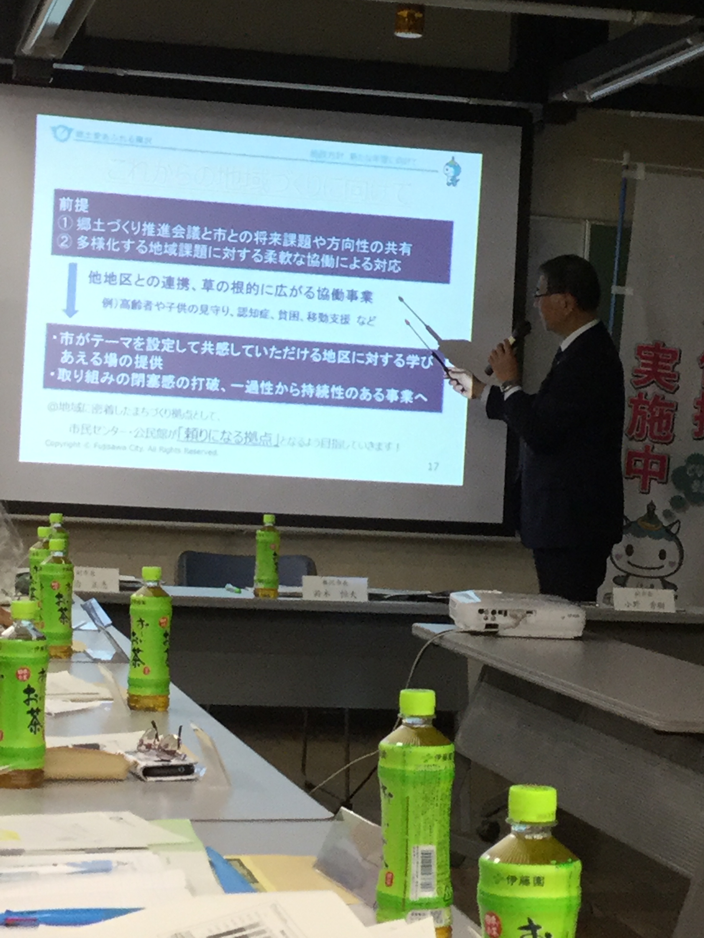 宮地副市長からは『超高齢社会は必ずくる。前向きに受け止めて明るい高齢社会をつくること。健康寿命を延ばすポイントは、食事、運動、社会参加です。』小野副市長からは『委員の皆さんの意見をお伺いして、課題意識も高く、このまちが大好きという気持ちからくる、可能性を感じた。』鈴木市長からも『郷土づくり推進会議と藤沢市との将来課題や方向性の共有をしながら、地域に密着したまちづくりの拠点として、市民センター・公民館が「頼りになる拠点」となるよう目指していきます。』とお話ありました。