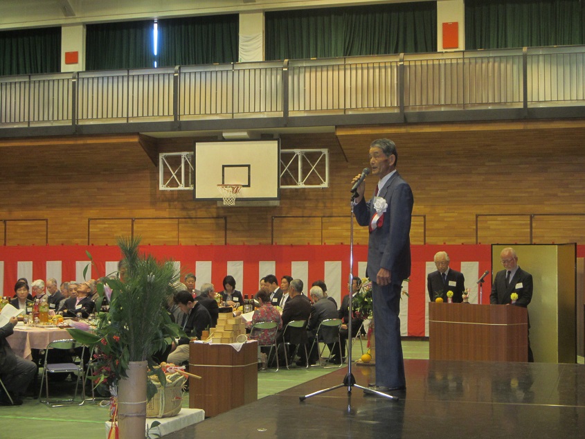 全員による藤沢市歌の斉唱、市民憲章の唱和に続き、川口地区自治会連合会会長の主催者挨拶、鈴木市長の新年挨拶、その後、鈴木市長をはじめ中村市民センター長、川口会長、年男の畠山友一様、年女の東谷聡子様の5人による鏡割り、乾杯と続き、そして歓談となりました。