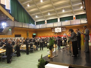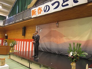 全員による藤沢市歌の斉唱、市民憲章の唱和に続き、川口地区自治会連合会会長の主催者挨拶、鈴木市長の新年挨拶、そして代表者による鏡割り、乾杯の後、歓談となりました。