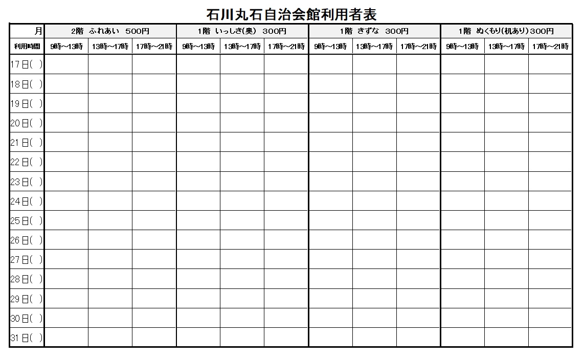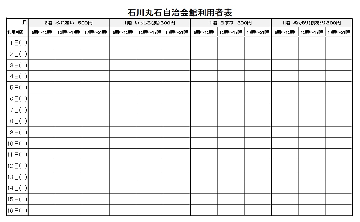 会館利用方法印刷2022/05/30 11:28 投稿者:石川丸石会館利用料について予定表一コマの利用料になります ふれあい→500円 いっしき・きずな・ぬくもり→300円 ※カラオケ機材・TVとDVDプレーヤーの貸し出し(各500円)も始めましたので、月曜日・金曜日の午前中に自治会館にてお問い合わせ下さい。 電話番号 0466-86-5007 メールアドレス ishikawamaruishi@hotmail.co.jp 石川丸石自治会 ホームページへ戻る