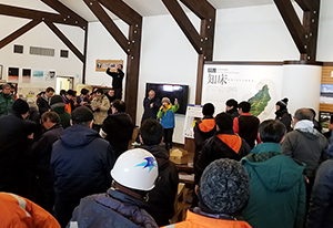 訓練では、冬期の積雪・路面凍結の影響を考慮し、GPSロガーを利用して避難経路や避難時間を計測するなど、主に以下について検証し、漁村センターに集合し、知床ウトロフォーラム21(ウトロ自治会)桜井事務局より、これまでの地区防災計画の取組みや計画内容案を説明したあと、津波避難訓練に参加した地区住民等(約80名)が意見交換を行い、課題をまとめました。