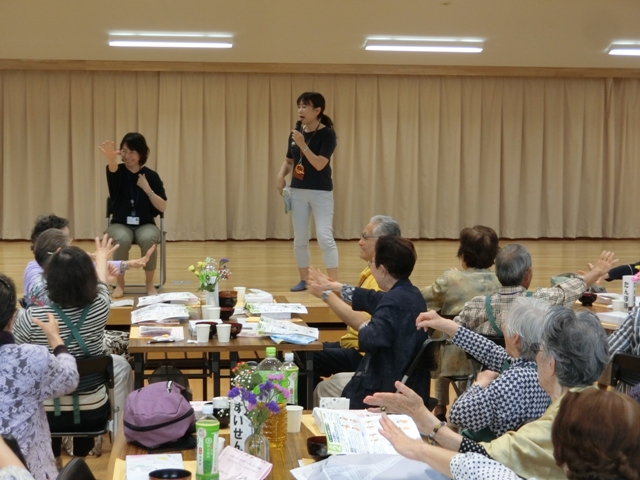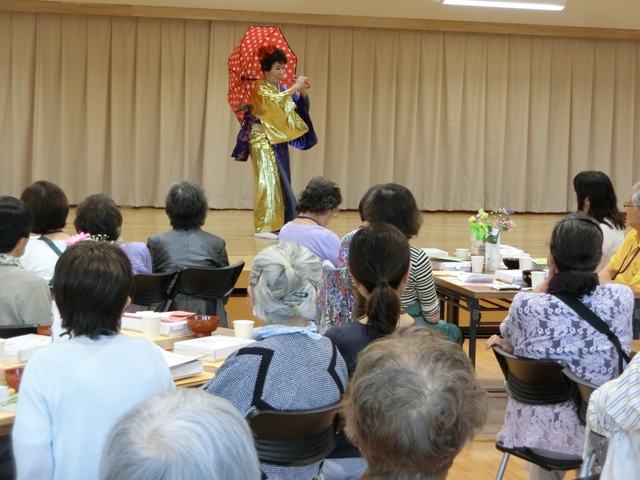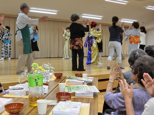 舞扇会の日本舞踊を真剣に見入る参加者、手足の左右に違う動きをさせて脳の混乱を誘い、活性化につなげる権脳体操で頭がグルグルとなりました。