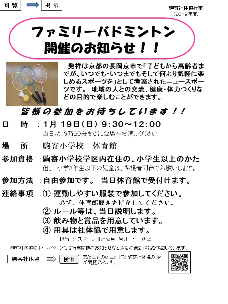 期日 : 2024年5月19日(日) 場所 : 駒寄小学校グラウンド 集合 時間 : 9時30分 ~ 12時(9時20分集合) 内容 : グラウンドゴルフ (雨天やグラウンドコンディションが悪い場合は体育館で室内ペタンクを実施 体育館履きを持参してください) 参加対象: 社体協担当…