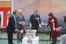 第一部では、全員による藤沢市歌の斉唱、市民憲章の唱和に続き、山本湘南大庭自治会連合会会長の主催者挨拶、小野副市長の新年挨拶、その後、山本会長、小野副市長、高橋市民センター長、年男の三上司様、年女の岩本敦子様の5人による鏡割り、そして乾杯へと続きました。