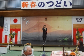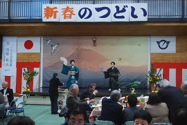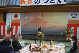 第二部では、鈴木市長、平岩教育長の新年挨拶、大庭八寿花会の皆さまによる日本舞踊、そして佐原竹男さんの吟詠と剣詩舞があり、最後に横山滝の沢地区社会体育振興協議会会長の三本締めで、賑やかな閉会となりました。