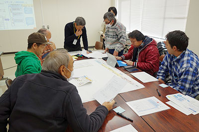 前回ワークショップ(11/16、WS2)にて整理した災害時の対策と平時からの備えをもとに作成した地区防災計画の素案を確認し、今後、地域が継続して運用しながら検証・見直しのための具体的な方法や協力関係者について議論・整理しました。さらに、計画運用主体及び構成員、検証・見直し方法や防災マップの記載内容を検討しました。