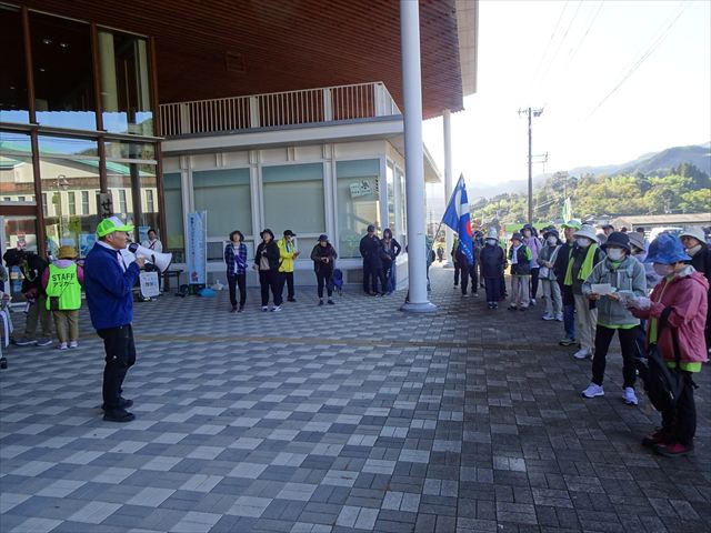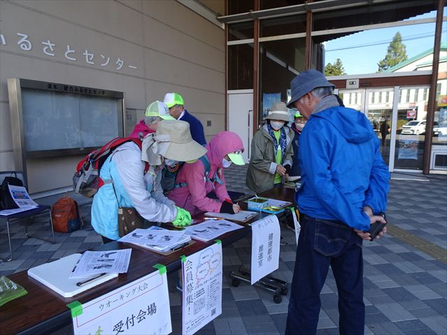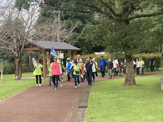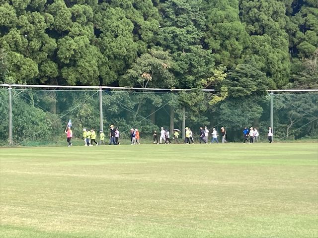 前日に役員で「道しるべ 下見」を行って、コースを確認。大会当日の19日は「大運動会」と同時開催なので、スタッフ等朝7時には駐車場は車が多かった。受付場所等の設営。9時頃には参加者の大部分が集まっていたので、9時に出発式を行い「コースと注意事項」の説明があり、リーダーの組島さん指導で「ストレッチ体操」を行い、身体をほぐした。大迫リーダーを先頭に4.7k健脚コースが出発、参加者の半分以上がチョイスした。遅れて、3k一般向きコースが松埜リーダーを先頭にスタートした。