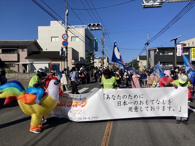 11月23日(日)小林秋まつりに今年も「仮装パレード」で参加。今年は大迫氏の大型仮装が一番の人気で注目を集めた。恒例となった永山氏のひょっとこ踊りではいつも通り沿道での拍手で盛り上がった。会長は「コイキング」で参戦。ツーデーマーチのチラシ300枚は完売。