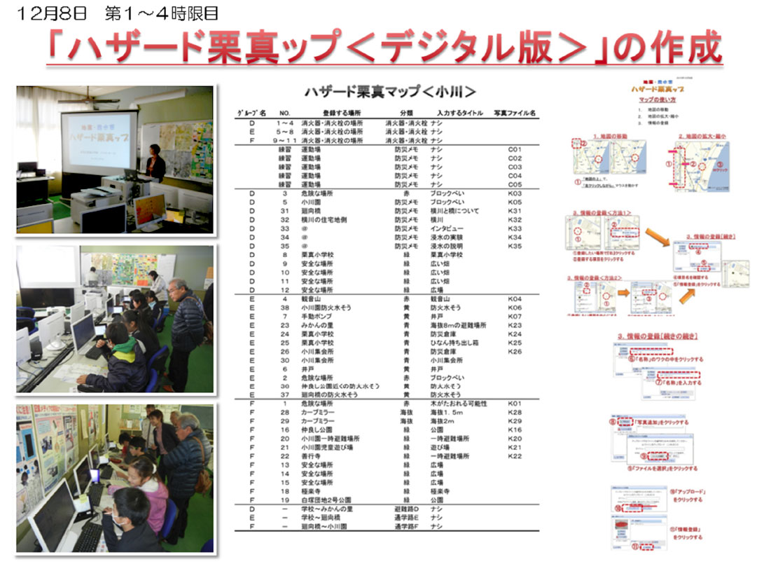 | 活動の概要 | 栗真小学校校区は、東側は伊勢湾、西側は横川・志登茂川に囲まれており、古くから水害と隣り合わせの地域である。これまでも防災マップ作成を行っており、今回、次のステップとして、デジタル防災マップを作成することにより、防災学習内容を地域に発信していきたいと考え実践した。 |