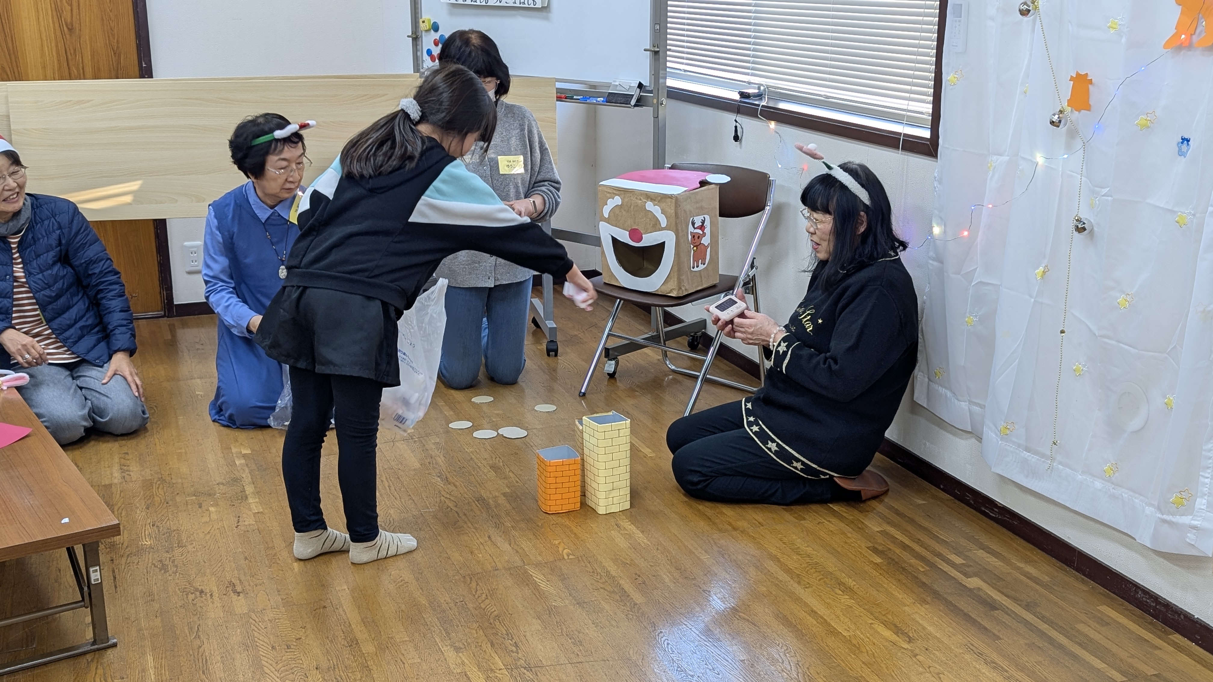 今日のゲームは去年もやったクッキートスと煙突にミニプレゼントを入れるゲーム。ゲームの記録カードに名前を書いて準備万端。みんな真剣です。今回は小学生が記録や枚数を数える係等を行いました。