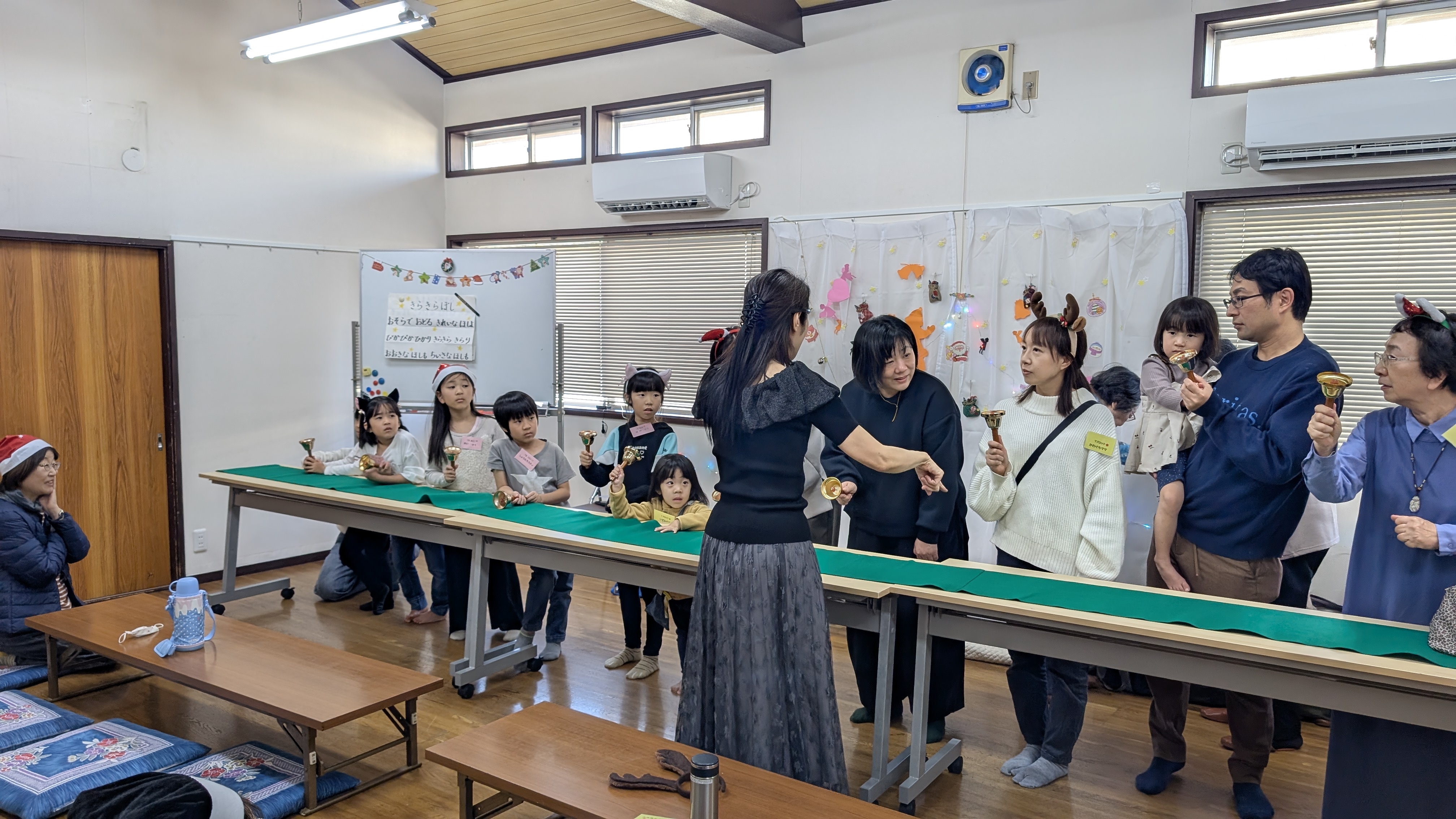 今回はハンドベルの鑑賞と体験です。御所見より6人のメンバーと先生が来られ、クリスマスソングやディズニーの曲を聴きました。体験では『キラキラ星』と『きよしこの夜』のハンドベル演奏に挑戦!指揮の先生の合図をよく見て演奏できましたよ!