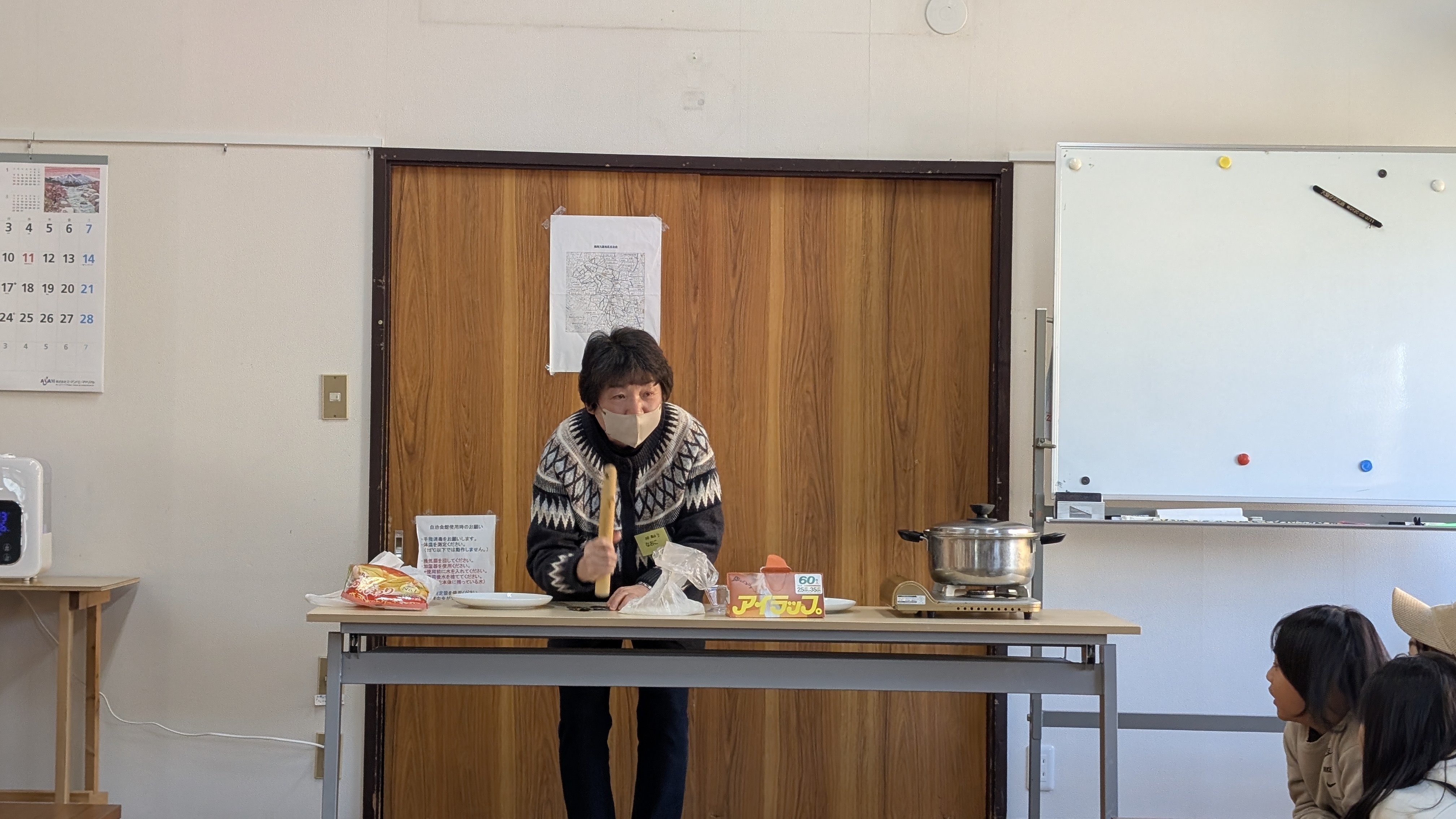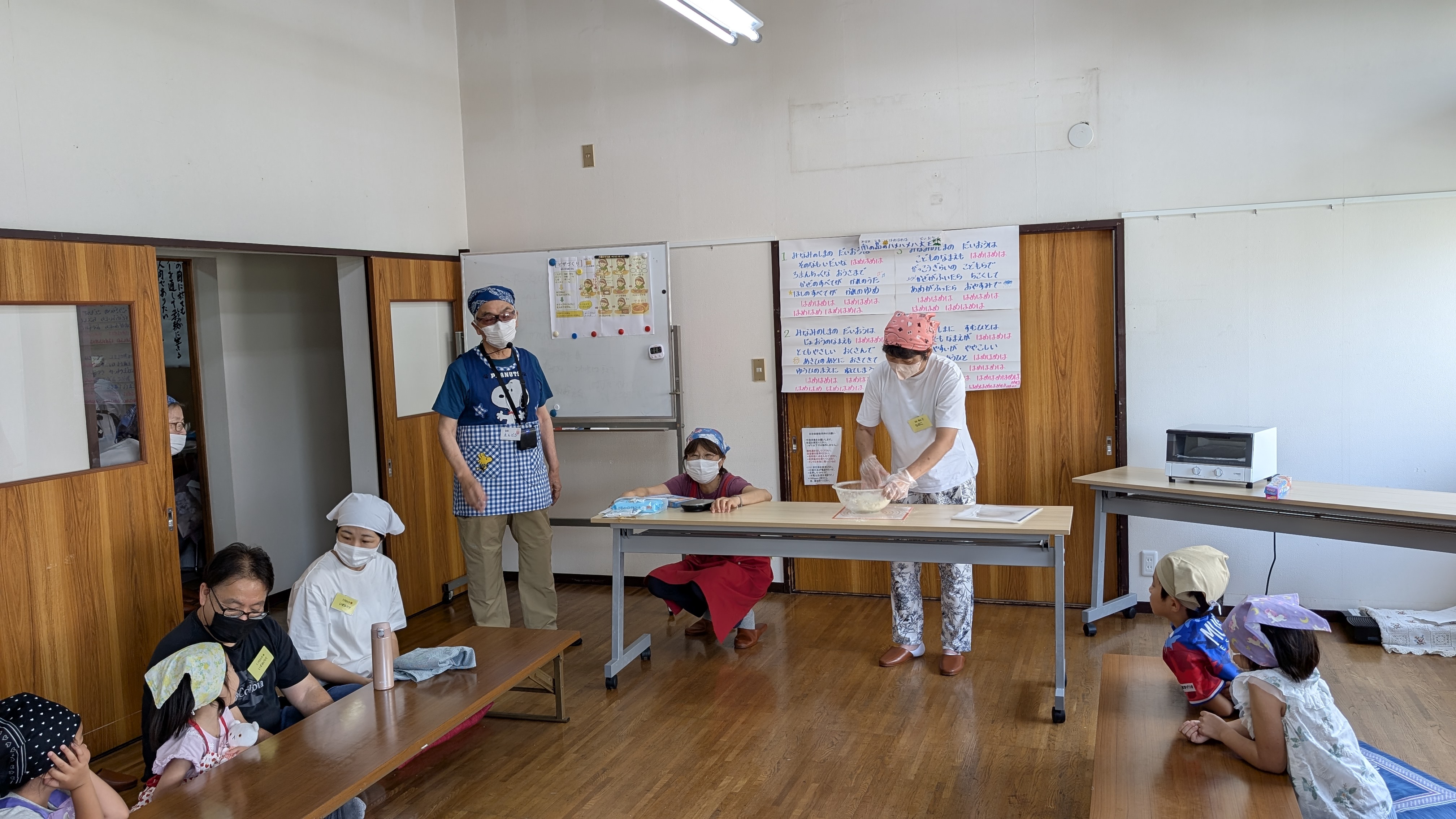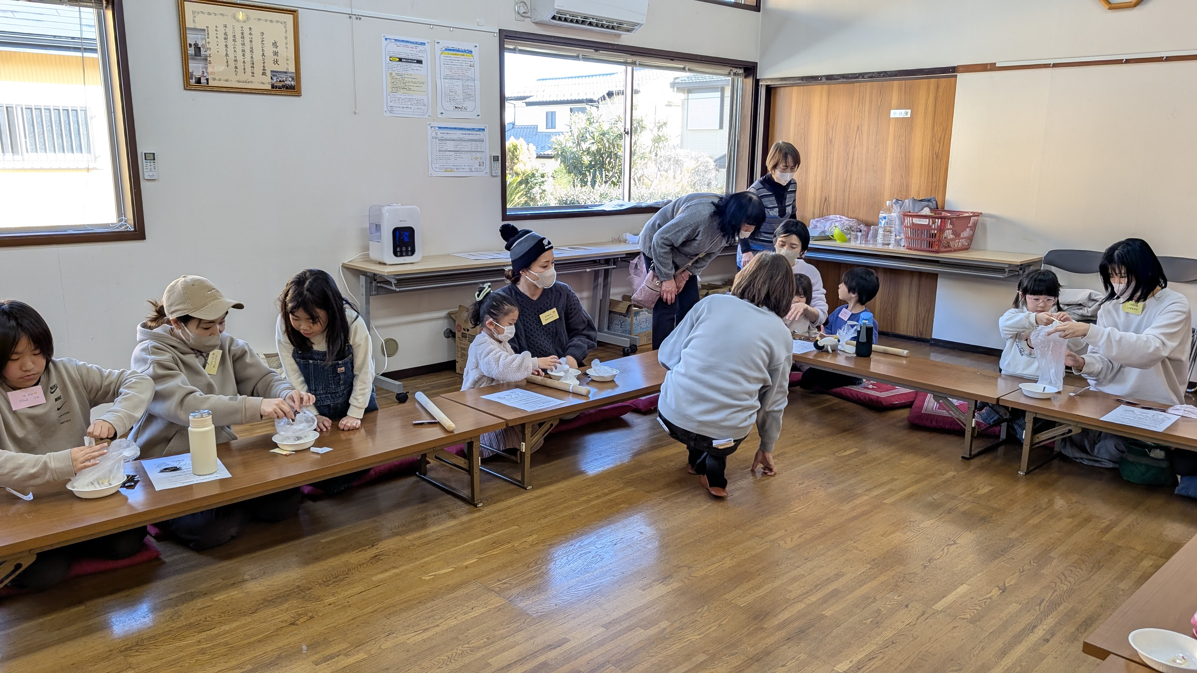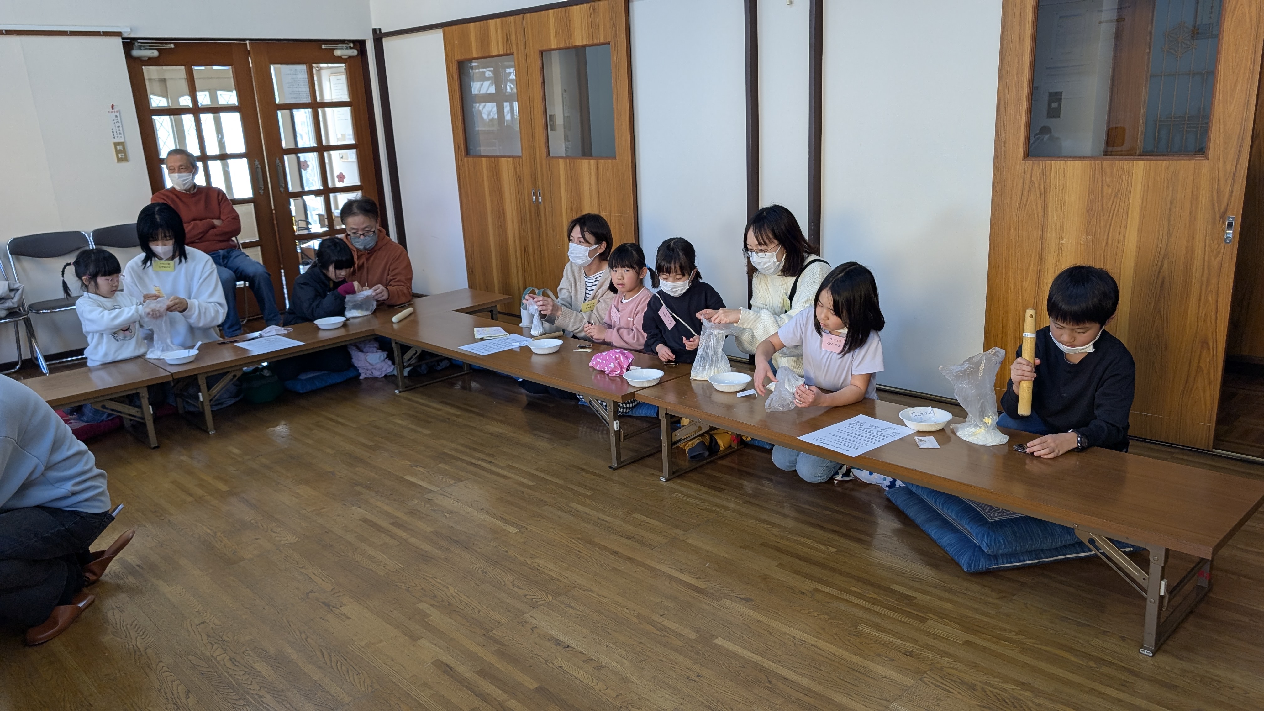 小糸南自治会・交流ネットワークの遠藤泰介さん(8B)に教わりました。見本をみます。まずは材料を混ぜるです。みんな身を乗り出して興味津々で見ています。次はこねる。タイマーを5分にセットしてこねます。後半は生地をバン!と叩きつけ迫力満点。そして最後はみんなでカウントダウン。「10、9、……3、2、1、ゼロ!」5分間こね続けたスタッフ大きな拍手!
