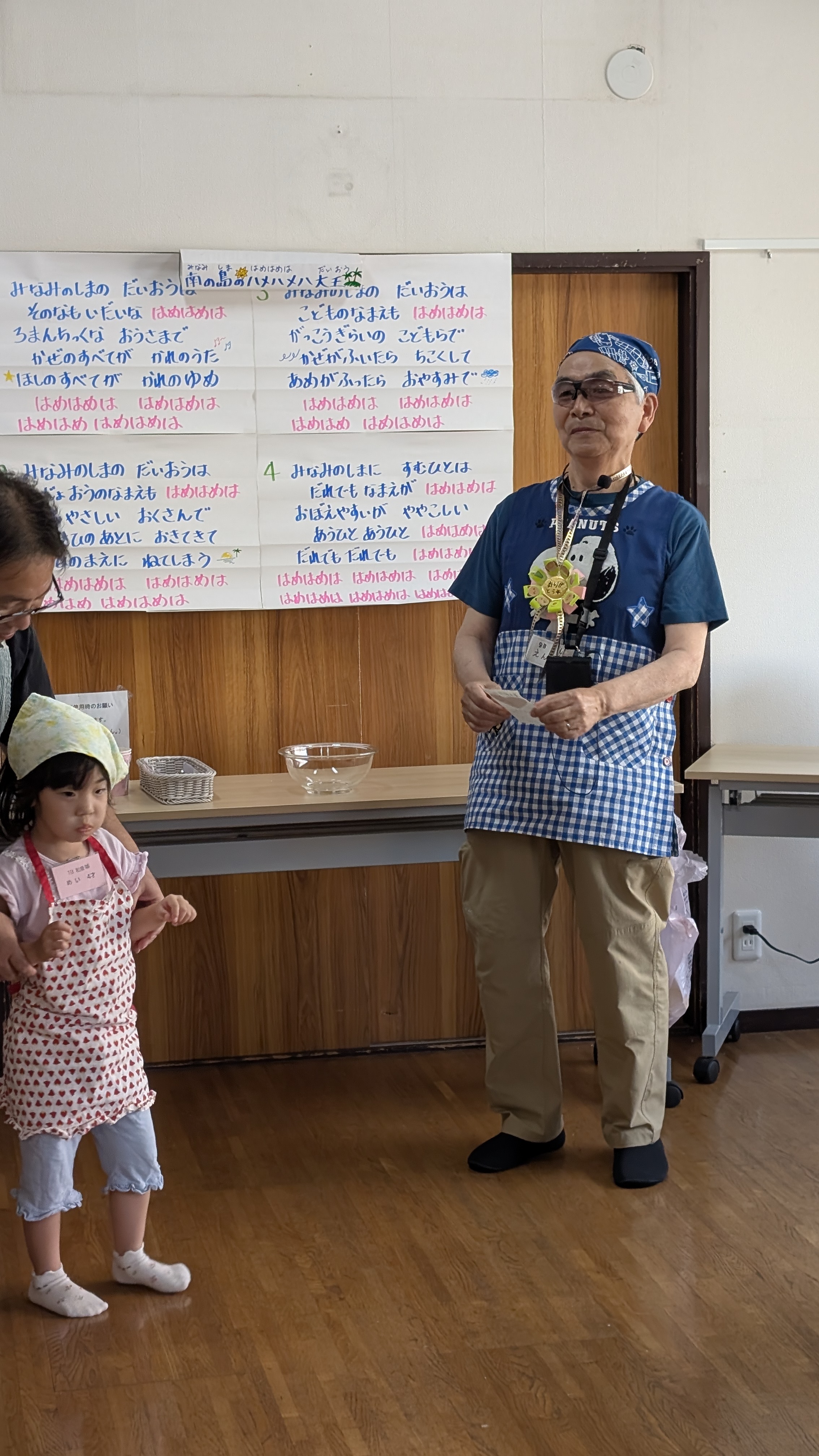 受付を済ますと今回はいつもと違う和室で、こっそりとプレゼントのメダルの中央に『ありがとう』のメッセージ書きです。キラキラ星ときよしこの夜の歌を練習。