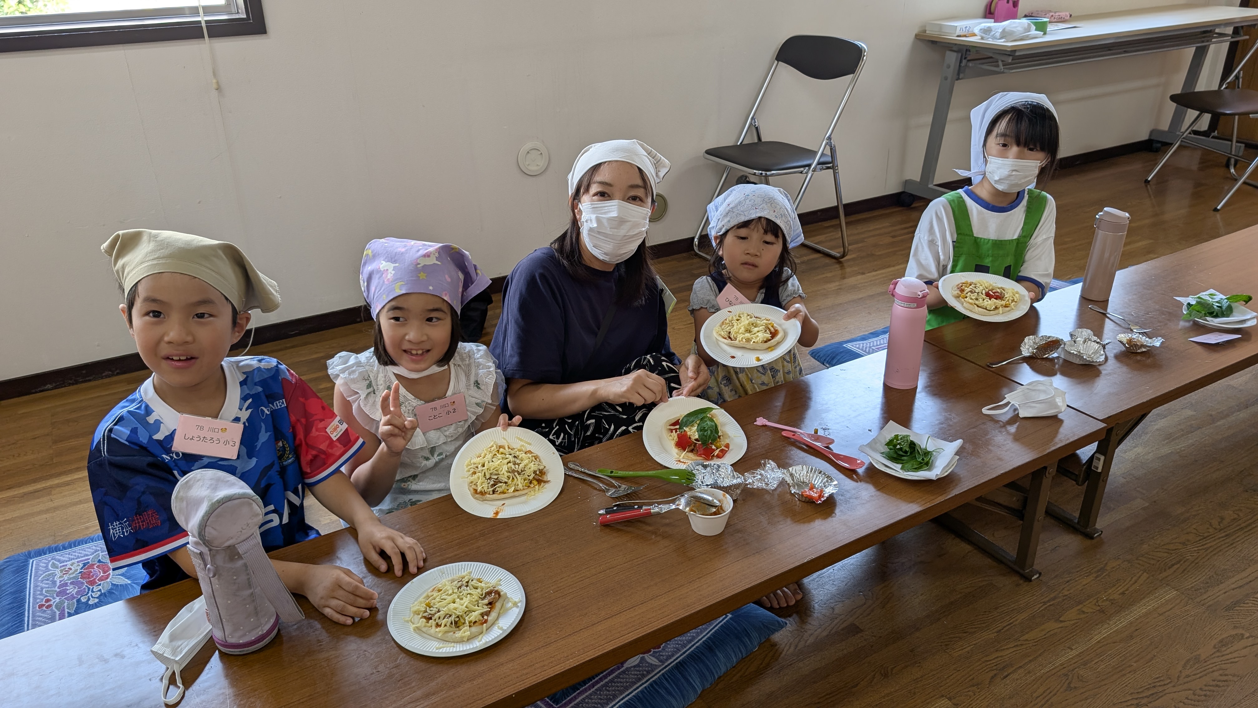 オーブントースターに入れますよ~ はやく焼けないかなぁ~と覗き込んでます。待っている間に三角巾姿の集合写真。みんなステキですね。