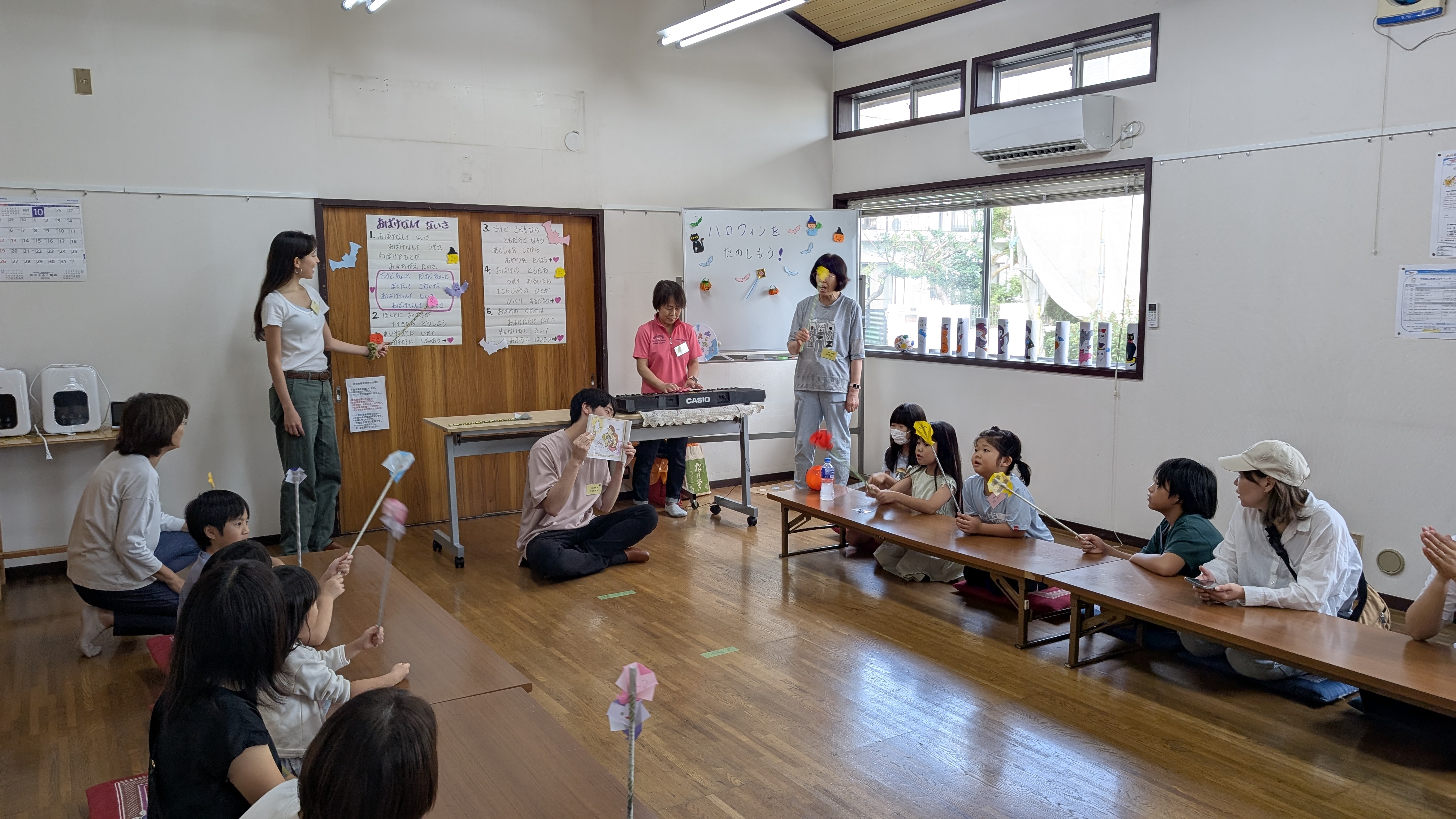 歌はハロウィーンに因んで『おばけなんてないさ』です。お姉さんから受け取ったスティックでリズムをとり、お兄さんが見せてくれるくるくるイラストを見ながら、歌いましたよ~