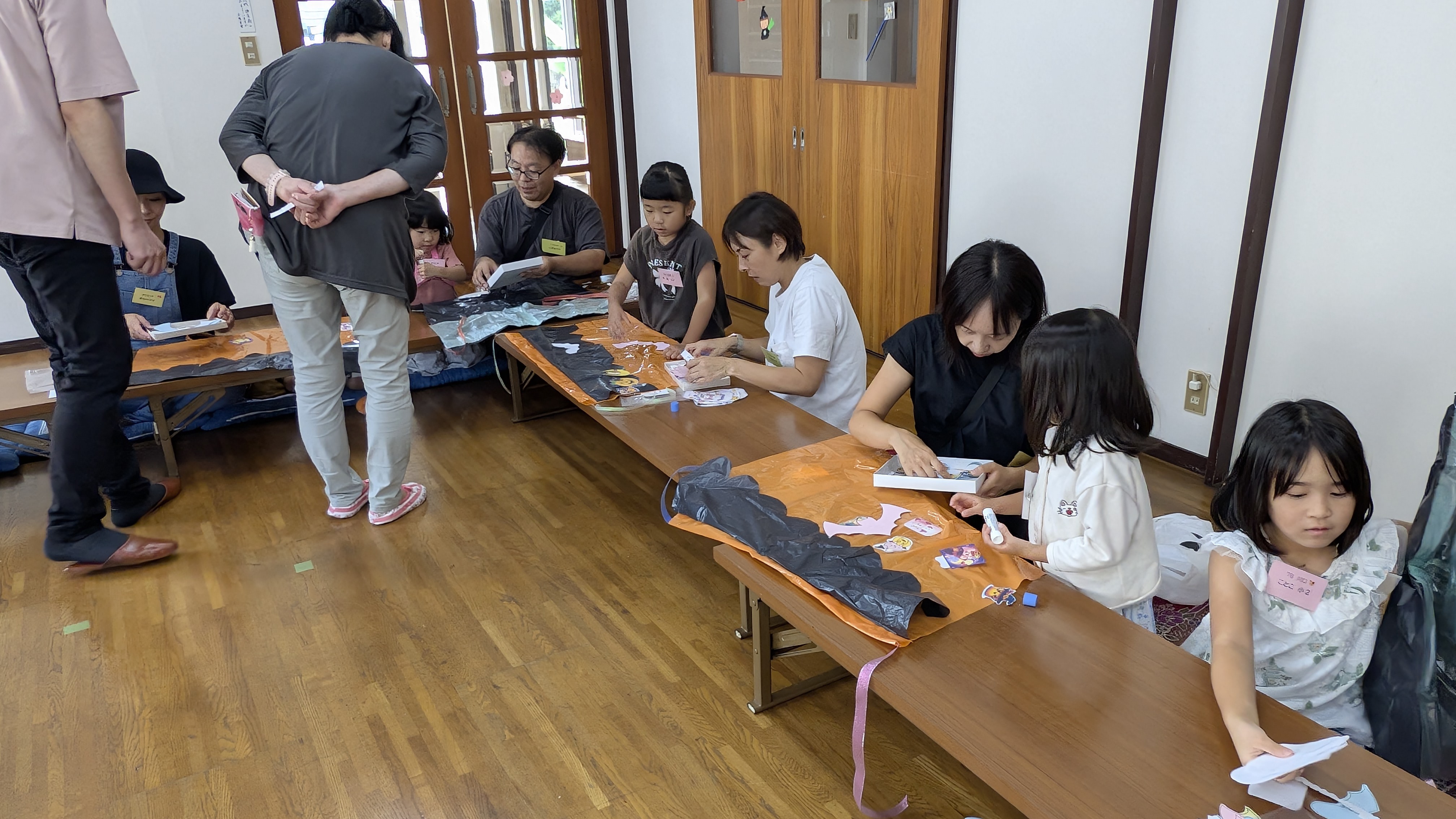 席に座ると、コピー紙にハロウィーンのイラストを貼るお手伝い。これはいったい何になるのかな…?さぁ、始まりますよ~