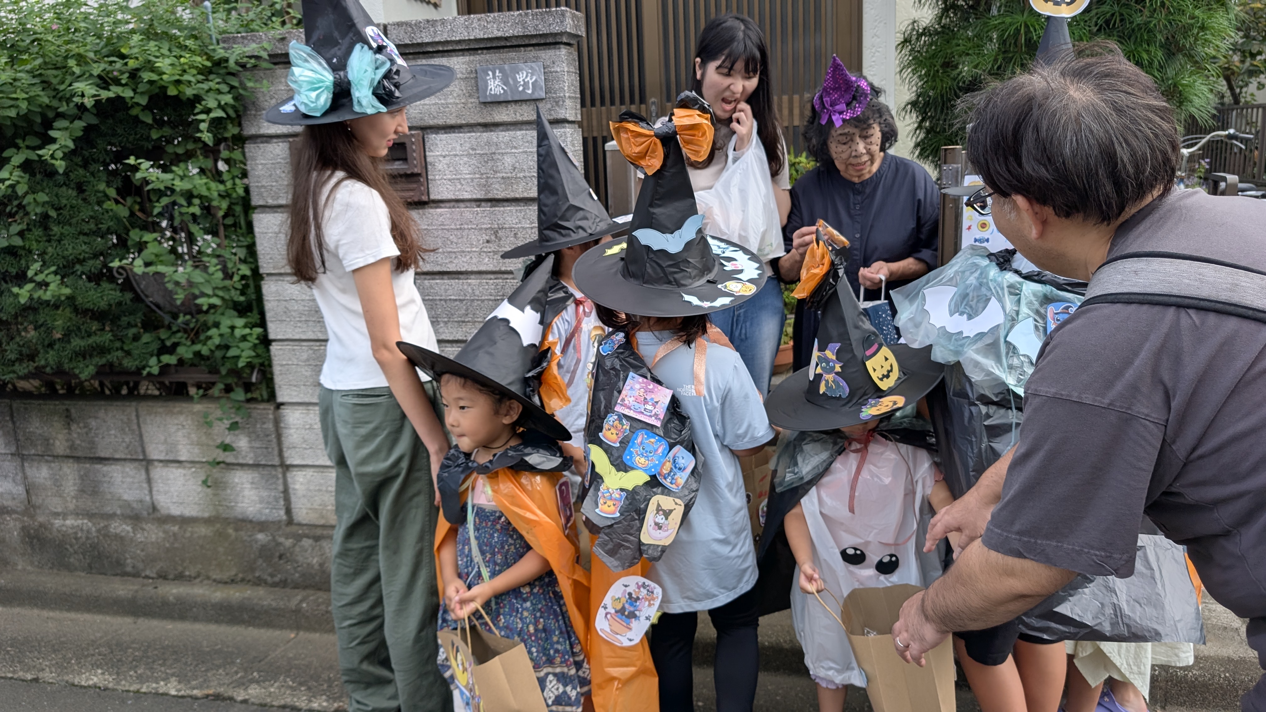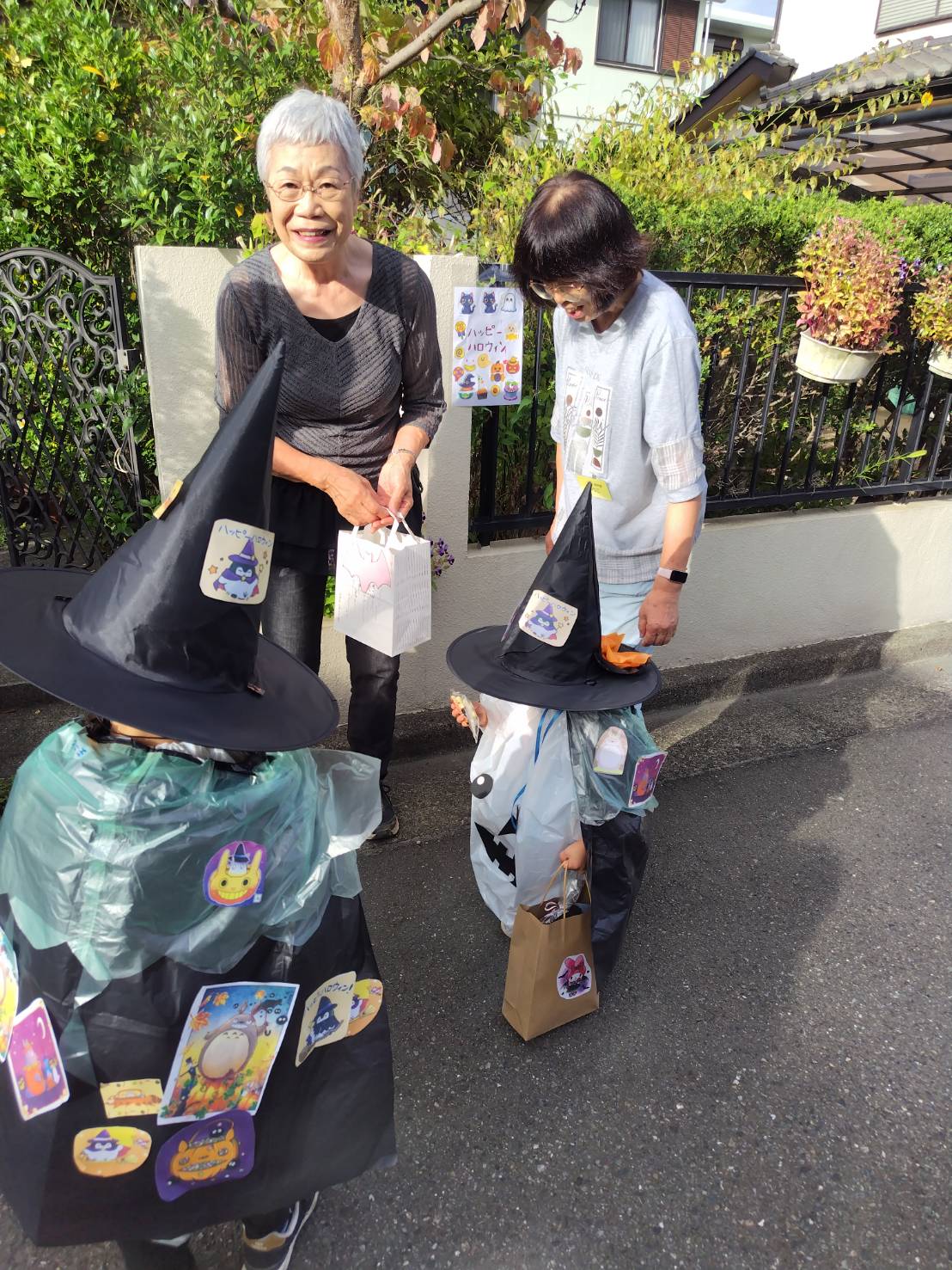 交通安全の確認とことばの練習してお兄さん、お姉さんと共に順番に出発です。今回も自治会館近くの4軒のお家にご協力頂きました。門に最初に作ったハロウィーンイラストが貼ってあるお家を発見。ハロウィンの飾りもあります。ドキドキしながらも「トリック オア トリート」と言い、お菓子をもらいます。最後は「ありがとうございました」としっかりとお礼。さすがです。 今年も付き添った保護者の方を含め、ささやかな自治会内の交流が出来ました。お菓子を手にみんな笑顔で戻って来ました。
