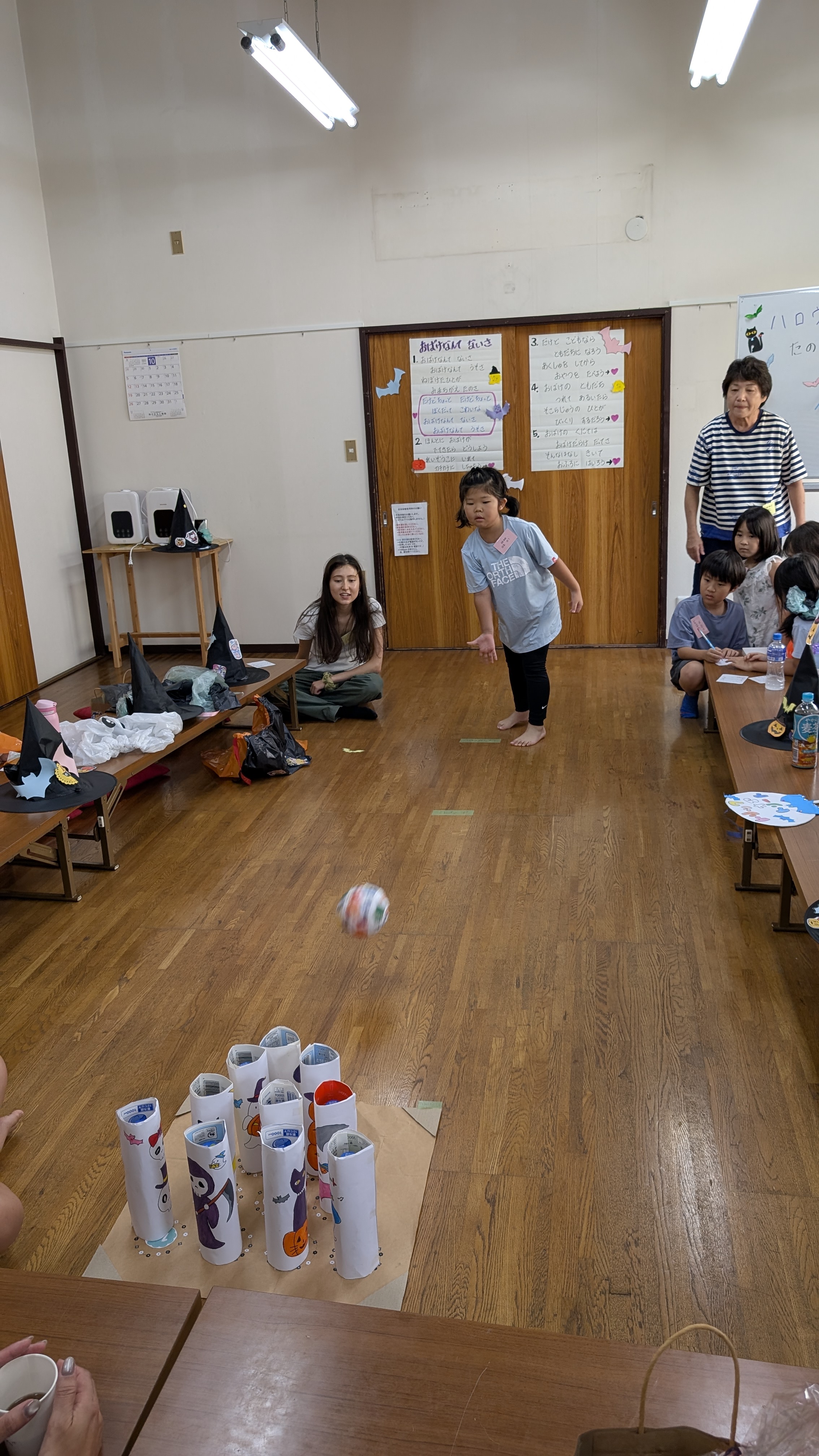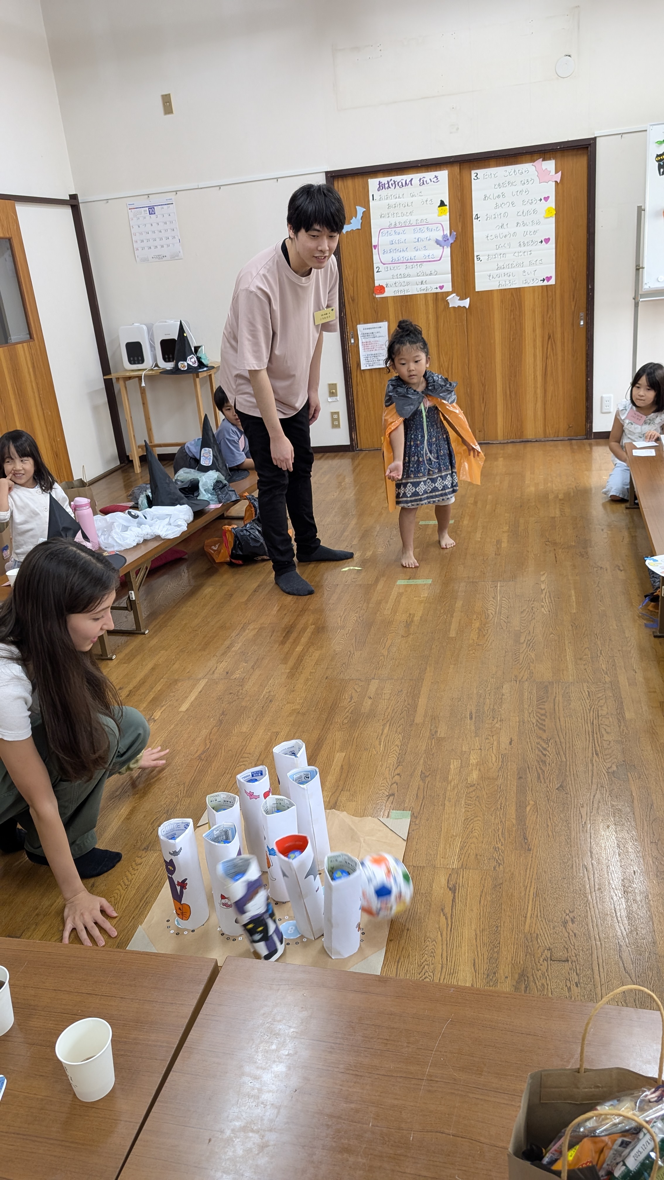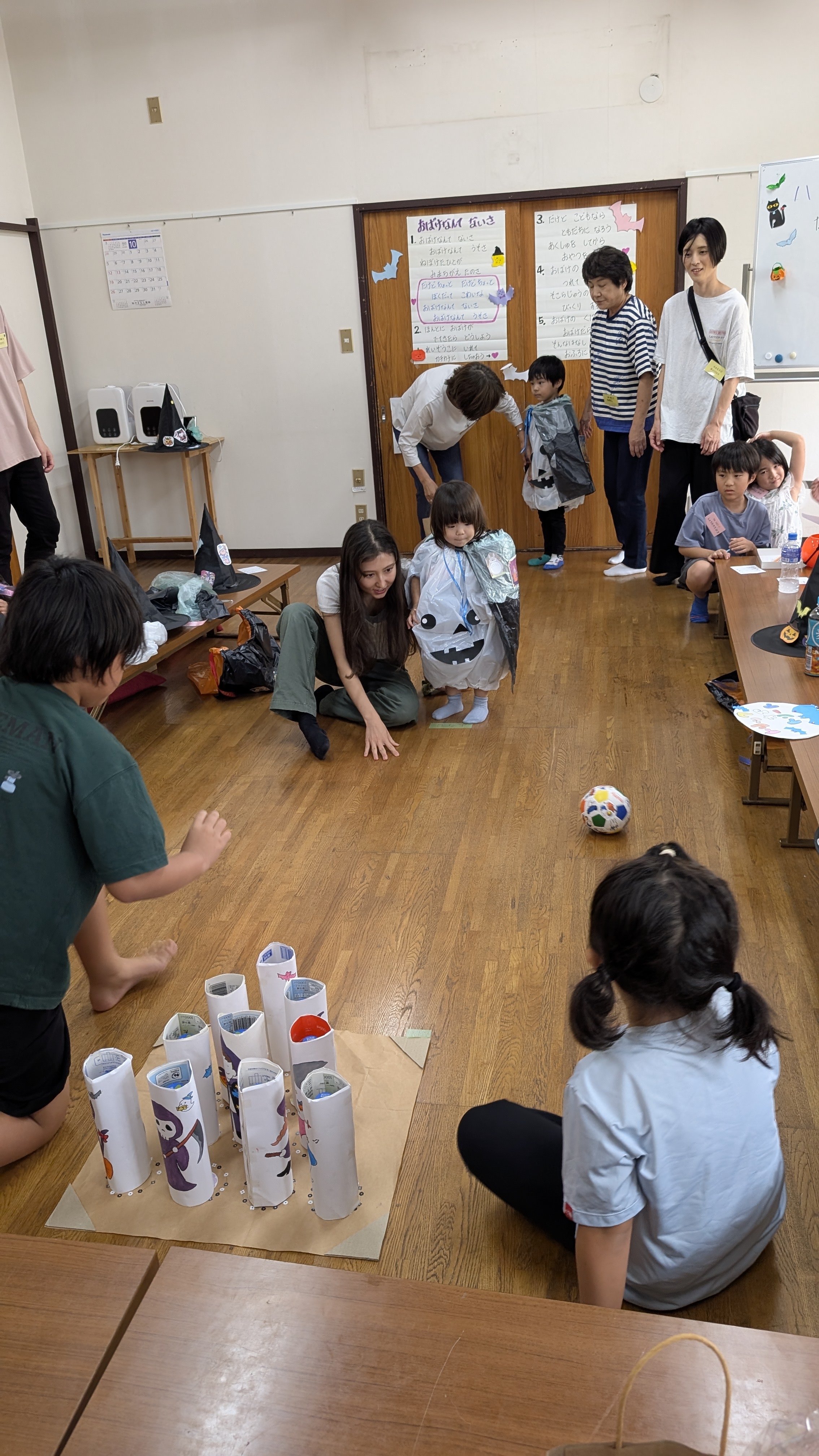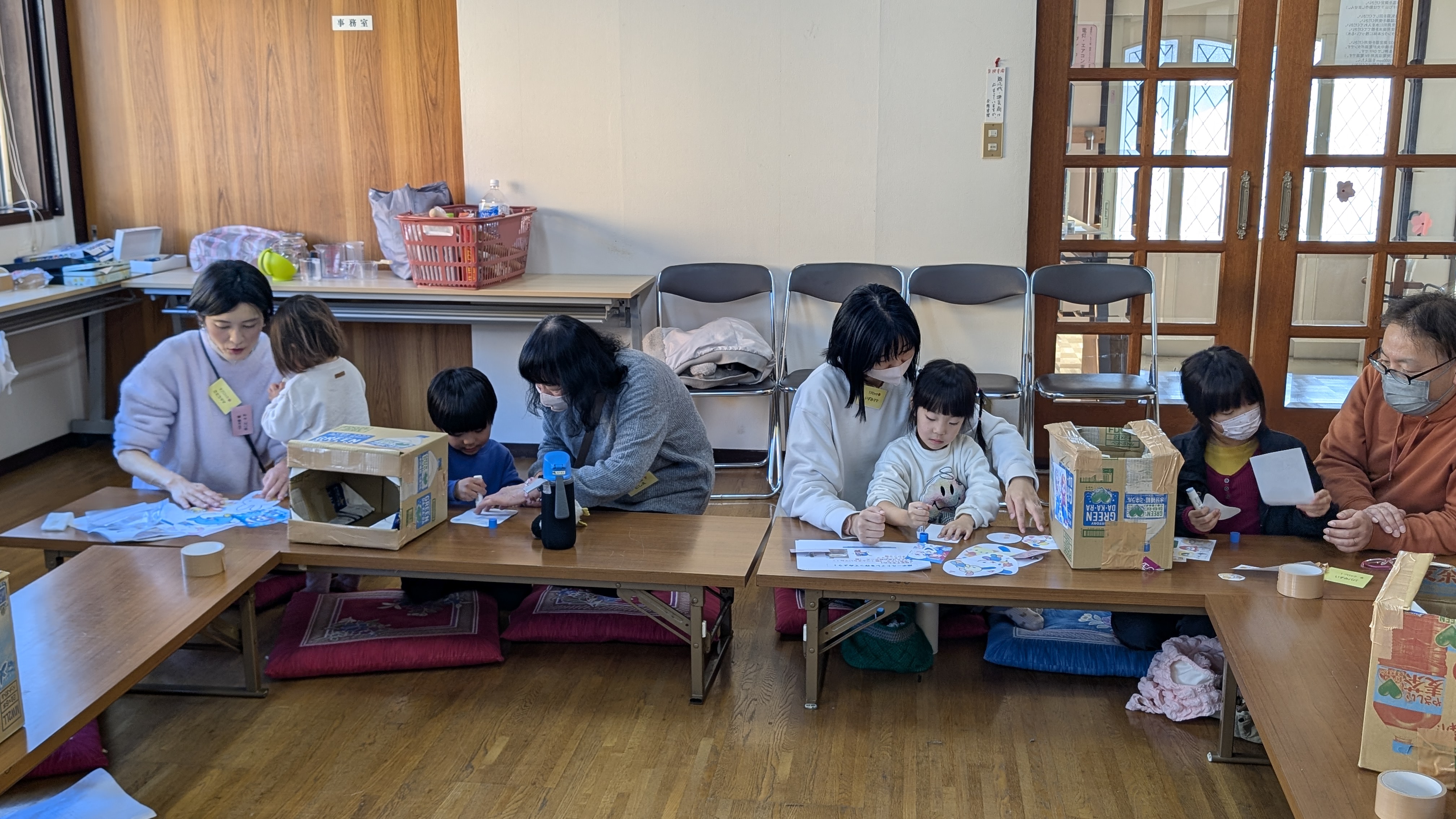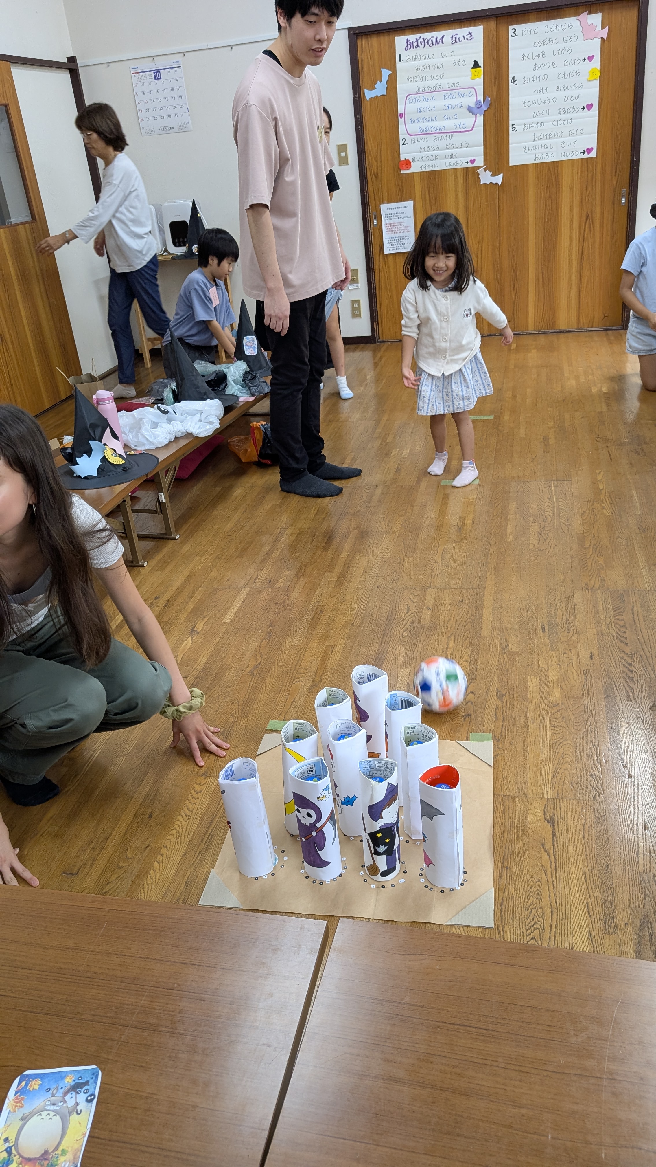 今回のゲームは節分の鬼退治をテーマに、鬼の的当てゲームと鬼のピンを倒すボウリングゲームです。的当てゲームは紙コップの鬼に、ボールを5回投げます。ボウリングは2レーンを順番に投げます❗️今回も皆で役割分担をしました。得点を数えたり、ゲームカードに得点を記入したり、倒れたボウリングのピンを並べる係りなど皆で頑張りました。昨年転入したばかりのママも、的当てゲームの得点記入で参加です。ボールの投げ方も様々で、的に当たると鈴の音と皆の歓声で盛り上がります。ボウリングの得点の数え方と書き方も少し覚えました。ピンを揃えて並べる係りは、逆さまに立てたのを直したり大変な作業でしたが、最後まで全員の分を頑張りました。ゲーム終了後は、ゲームカードをお兄さん鬼に見せて、お菓子をもらいました。ゲームも楽しく盛り上がりましたが、子供達の成長も感じて嬉しい一時となりました。