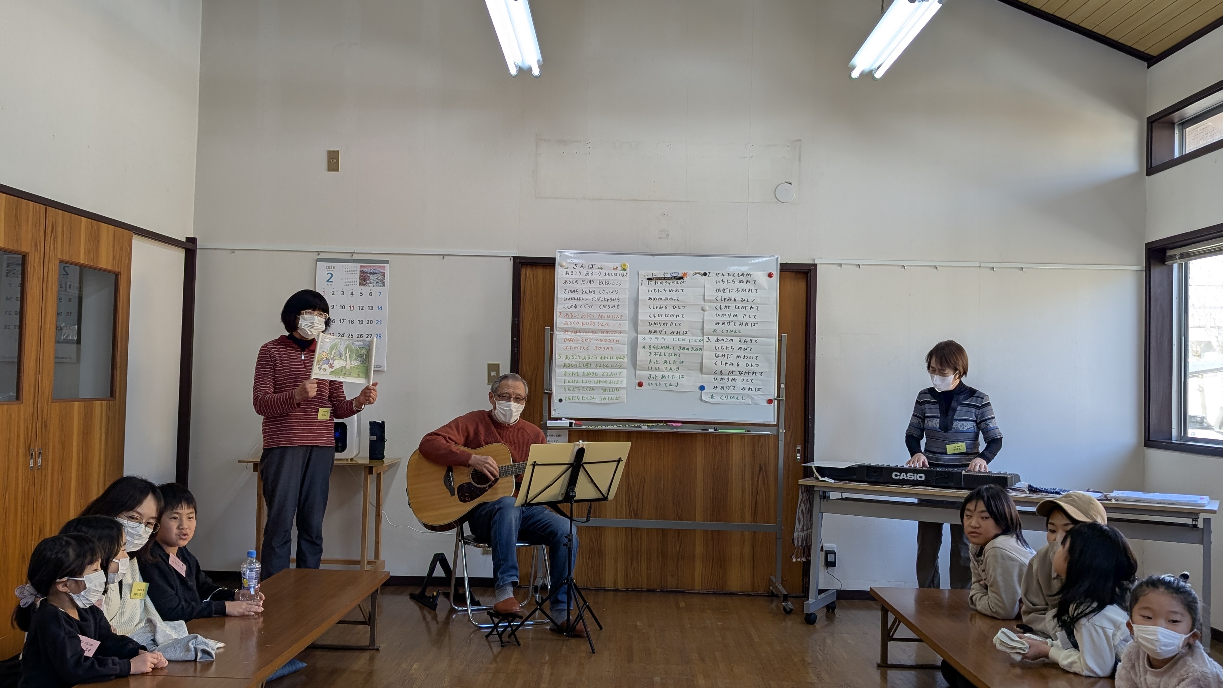 次は歌です。今回はいつものキーボードと講師でお招きした金子さん(8ブロック)のギター伴奏です。『さんぽ』に続き『にじ』を歌いました。こども達にもお馴染みの歌のようで大きな声で歌っていましたよ。