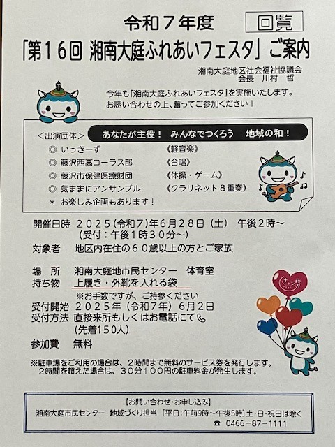湘南大庭地区社会福祉協議会では,「介護セミナー」を2026年(令和8年)1月15日(木)午後2時より湘南大庭市民センターで開催致します。募集定員は20人で先着順とさせていただきます。費用は無料です。今回のセミナーは高齢者の身体的特徴を共有していただくために、装具を付けて高齢者疑似体験をしていただいたきます。そして、福祉用具や福祉サービスを活用したやさしい介護と介護保険の利用について、湘南大庭いきいきサポートセンターの職員の方より解説いただきます。詳細は下に添付した回覧チラシをご覧ください。皆様のご参加をお待ちしております。