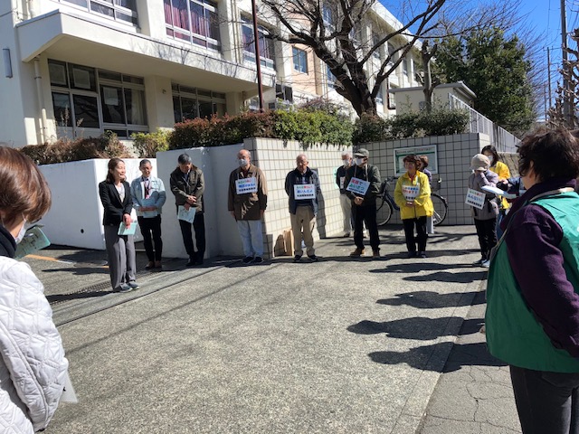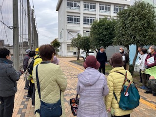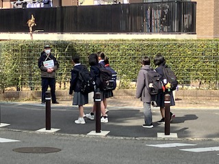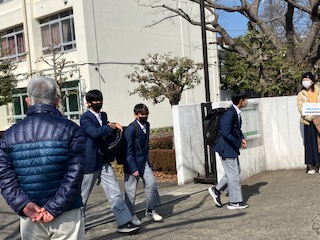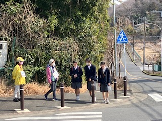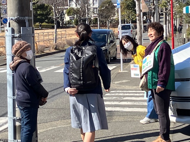 今回は地域の4団体、のべ80名ほどが試験期間中の一斉下校時に通学路に立って子どもたちにあいさつや声かけをします。この時期は、3年生が高校受験のため1・2年生が対象ですが、奉仕活動をする3年生の姿も見ることが出来ました。
