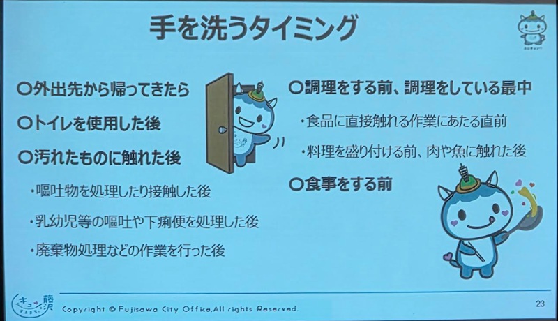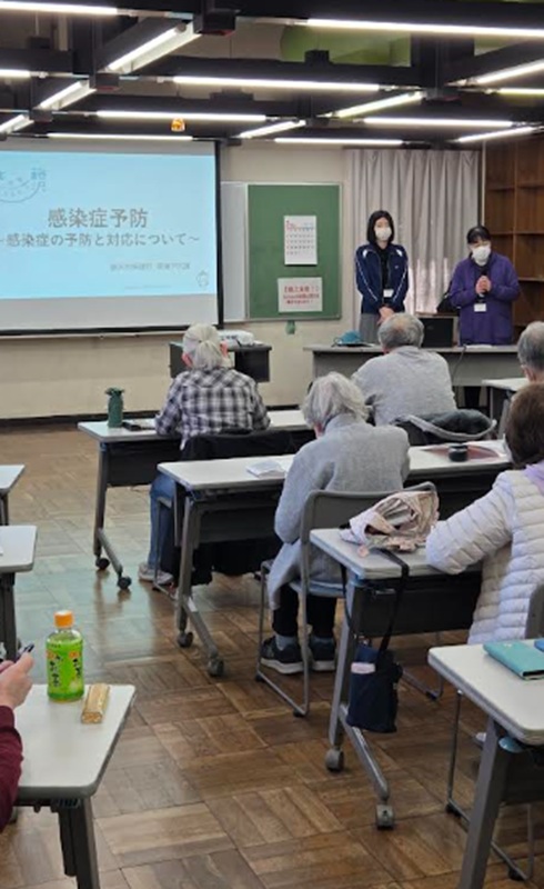 湘南大庭地区社会福祉協議会主催の講演会、高齢者がかかりやすい「感染症と予防対策」は、3月12日に開催されました。講師には、藤沢市保健予防課の保健師である新田氏、内田氏のお二人においで頂き、パワーポイントを使用して解説・説明いだだきました。その内容は、①感染症とは。②感染症対策の基本的な考え方。③気になる感染症。(感染性胃腸炎、新型コロナウイルス感染症、季節性インフルエンザ、結核)④手洗いについて。でした。感染症予防の基本は、「手洗いに始まり、手洗いに終わる」と言われているそうで、手を洗うタイミング、手洗いの順序、洗い残しの多い部分の説明や映像を見ながら、手洗いの重要性を再認識しました。 皆さんの関心も高く、質疑応答の時間は多くの方が質問しておりました。