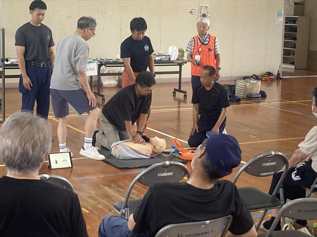 9時から訓練が始まり、段ボールベッド、室内テントの作成を防災部員が行いました。中央消防署3名が指導して心肺蘇生、AEDの取り扱いについて講義と実践を約1時間行い、参加者も真剣に取り組みました。防災部長(髙田氏)は持ち出し袋の展示と説明を行いました。最後に非常食の試食を行い概ね好評であった。SVC2,区民33名