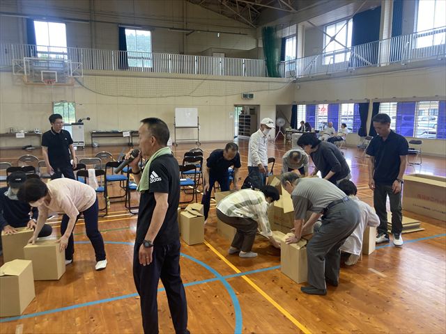 この訓練の目的は、南海トラフ地震のような広域の災害が発生したときに、 被災地への救援物資を運ぶ手順を確認するため、また、 避難所の運営においての炊き出しなどを行う訓練なども含まれています。