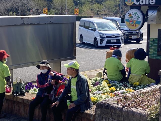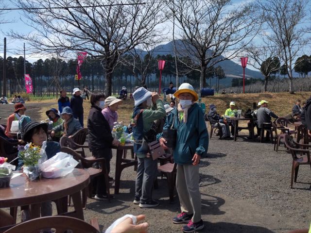 3月21日(土)今年も「牧場さくら祭り」と同時開催で「桜まつりウオーキング」を行った。 さくらがチラホラ咲いている木も見る事が出来た。来週が一番の見ごろであろうと思ったのは 私だけでは無い。自分の体力に応じて、距離が少し長い「ウサギさん」短い「カメさん」コースに分かれて歩いた。ゴールは牧場演芸館広場(祭り会場)で流れ解散。参加者は祭りにも参加。 恒例の花の苗プレゼントには配布前から行列が出来た。 宮崎市ウオーキング、市民、クラブ会員、総勢52名が「祭りとウオーキング」を楽しんだ。