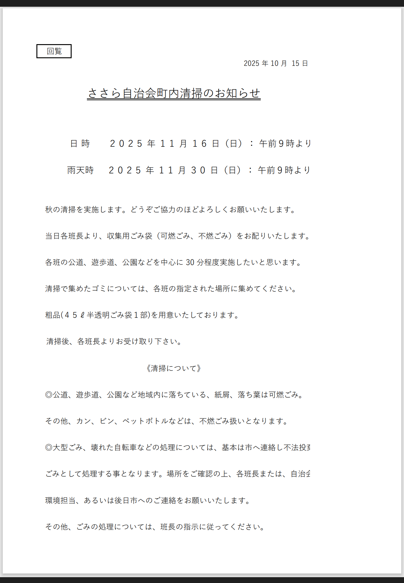 ささら自治会からの回覧 広報ふじさわの配布について 2026/01/25 16:01 投稿者:ささら自治会2026年度自治会会長選出について 2025/12/10 14:37 投稿者:ささら自治会ささら餅つき開催のお知らせ 2025/11/23 14:28 投稿者:ささら自治会防災避難訓練の安否確認結果 2025/11/23 14:22 投稿者:ささら自治会ささら自治会町内清掃のお知らせ 2025/11/23 14:21 投稿者:ささら自治会