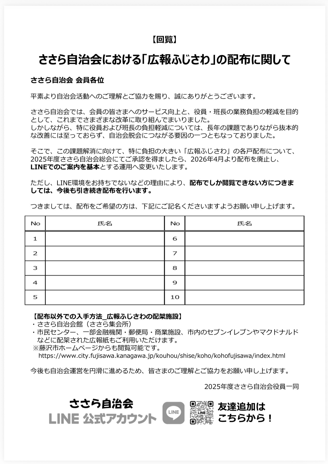 ささら自治会からの回覧広報ふじさわの配布に関して2026/03/10 15:19 投稿者:ささら自治会2026年度防犯パトロール参加のお願い 2026/02/03 13:32 投稿者:ささら自治会広報ふじさわの配布について 2026/01/25 16:01 投稿者:ささら自治会2026年度自治会会長選出について 2025/12/10 14:37 投稿者:ささら自治会ささら餅つき開催のお知らせ 2025/11/23 14:28 投稿者:ささら自治会